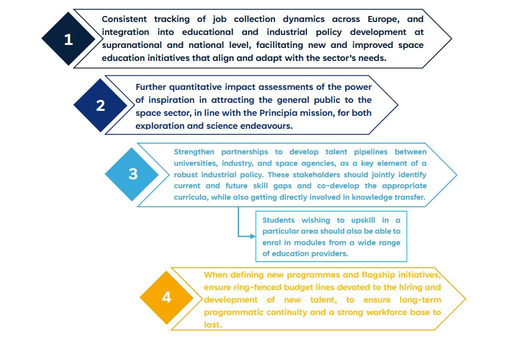 Существуют новые и обновленные программы развития и поддержки талантов, например, Космическая карьерная площадка Европейской комиссии, известная Программа стажировок для выпускников ЕКА и отраслевые инициативы (например, Программа молодых талантов TAS, учебный лагерь EnduroSat Space Challenges Bootcamp). Тем не менее, понимание динамики спроса и предложения талантов, тенденций и пробелов во всей цепочке создания стоимости в космической секторе ограничено. В новейшем отчете ESPI «Таланты в европейском космическом секторе: преодоление пробелов, построение будущего» представлен анализ чуть менее 3000 вакансий за 6 месяцев, позволяющий определить, какие навыки, опыт и профили наиболее востребованы представителями разнообразной выборки отрасли по всей Европе. Этот отчет был дополнен ответами более 40 специалистов по кадрам. В отчете также анализируется более 500 ответов студентов и молодых специалистов, начинающих работу в этом секторе, об их ожиданиях, внутренней мотивации и опыте.